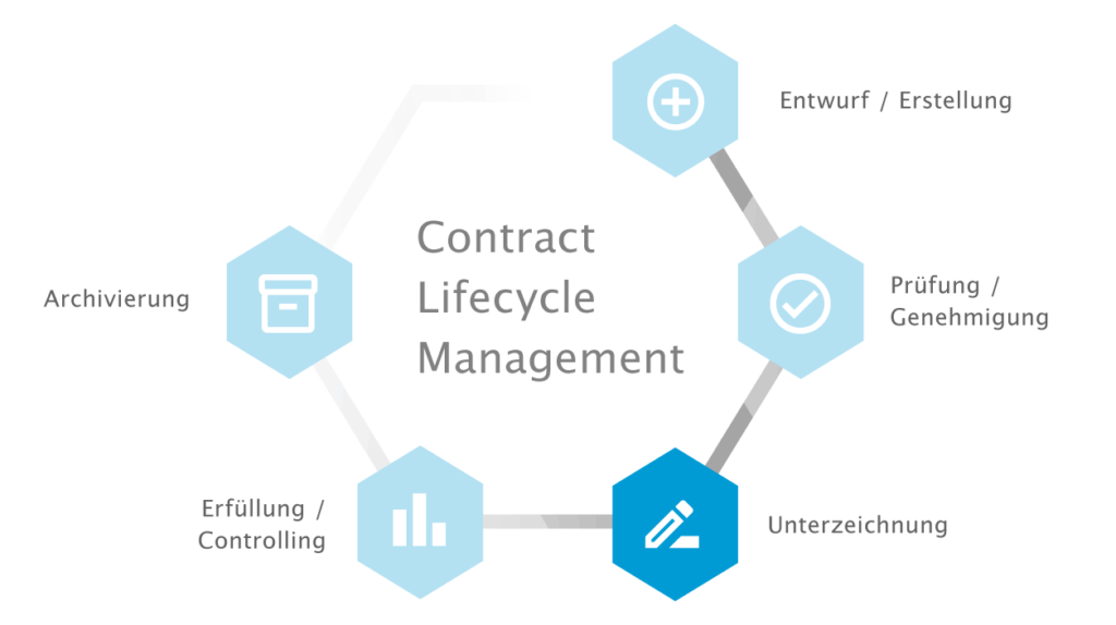 Die Vertragsunterzeichnung ist das Ziel aller Beteiligten und somit ein besonderer Schritt im Vertragslebenszyklus. Aus organisatorischer Sicht mutet die Phase der Vertragsunterzeichnung zunächst unkompliziert an, da die Vertragspartner lediglich eine Unterschrift leisten müssen. In der Realität ist die Vertragsunterzeichnung jedoch häufig ein langwieriger Prozess. Insbesondere wenn Unterschriften von mehreren Personen aus unterschiedlichen Regionen eingeholt werden müssen. Die Phase der Vertragsunterzeichnung ist beendet, sobald alle Parteien den Vertrag unterzeichnet und zusätzlich ein von allen weiteren Parteien unterzeichnetes Vertragsexemplar erhalten haben.